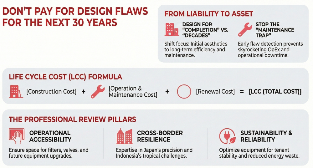 At DLNI, we provide a professional Maintenance-Focused Design Review service. Leveraging our deep expertise in facility management across Japan and Indonesia, we identify potential "maintenance traps" while the project is still on paper.